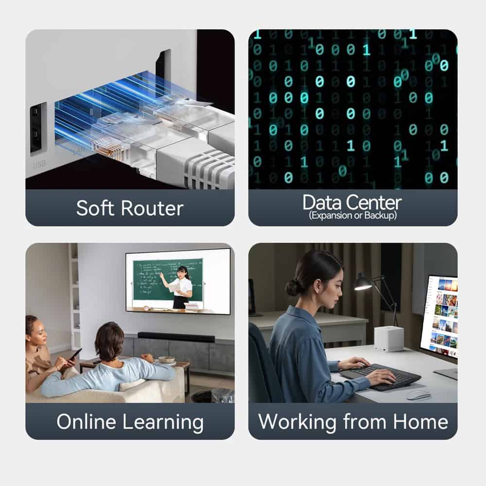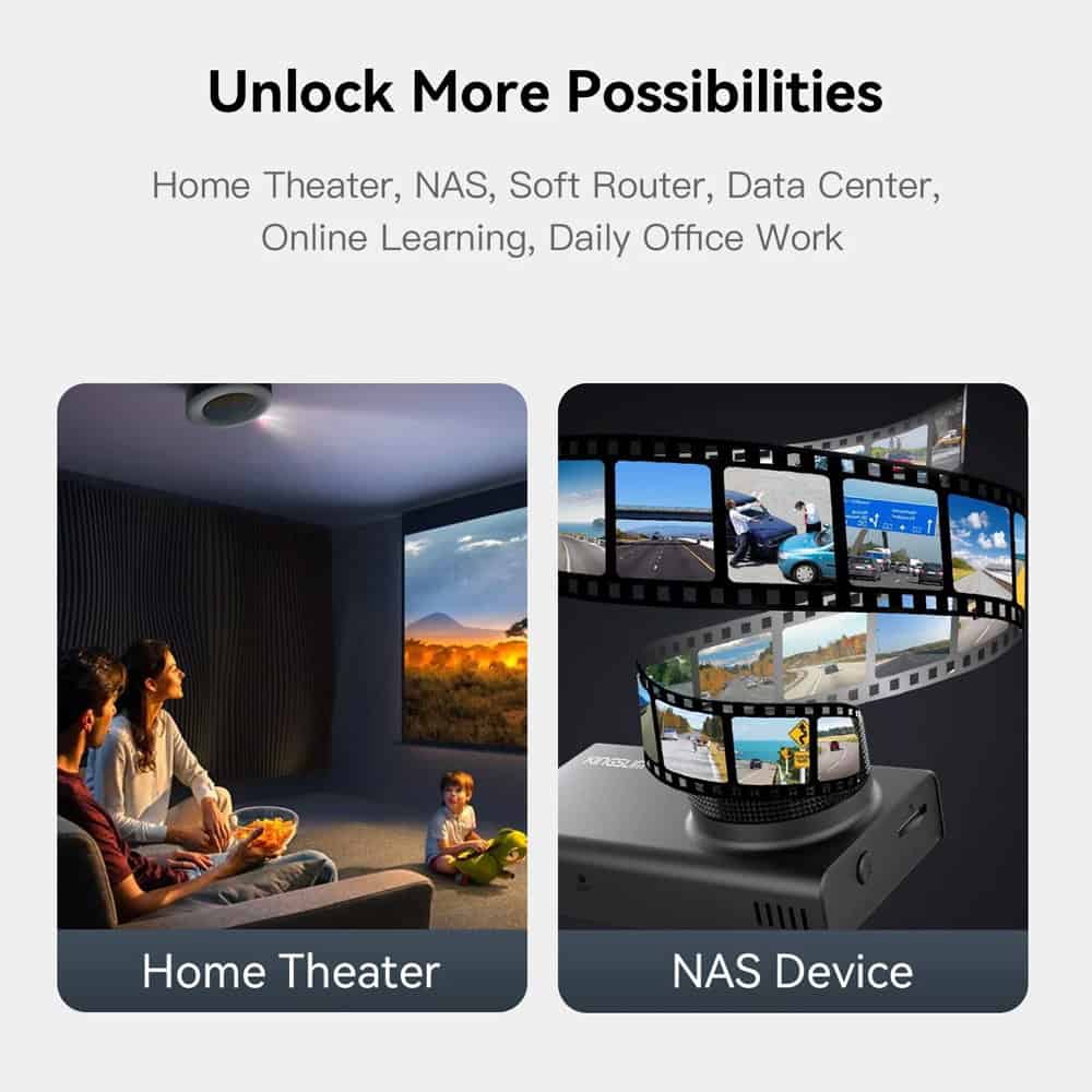 Χάρη στις πολλαπλές υποδοχές αποθήκευσης (έως 6x M.2 SSD) και τη διπλή θύρα δικτύου 2.5Gbps, το ME Mini μπορεί να αξιοποιηθεί και ως NAS (Network Attached Storage), προσφέροντας κεντρική αποθήκευση αρχείων, media streaming ή λύσεις backup για το σπίτι ή το γραφείο.
