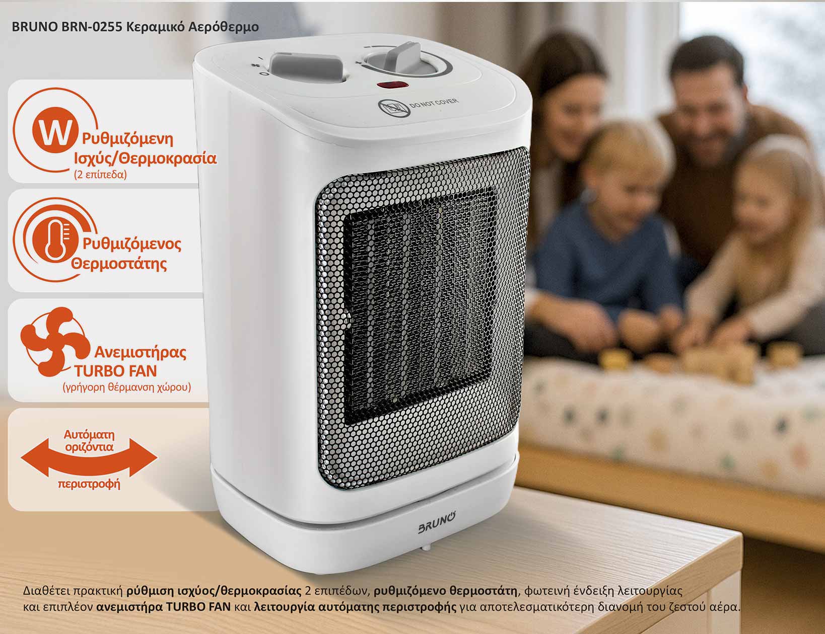 Το Κεραμικό Αερόθερμο BRUNO BRN-0255 είναι ιδανικό για γρήγορο και αποτελεσματικό ζέσταμα μικρών εσωτερικών χώρων και δωματίων και κρίνετε απαραίτητο για ένα νοικοκυριό ως βοηθητική-εναλλακτική λύση σε χώρους με ελλιπή θέρμανση.