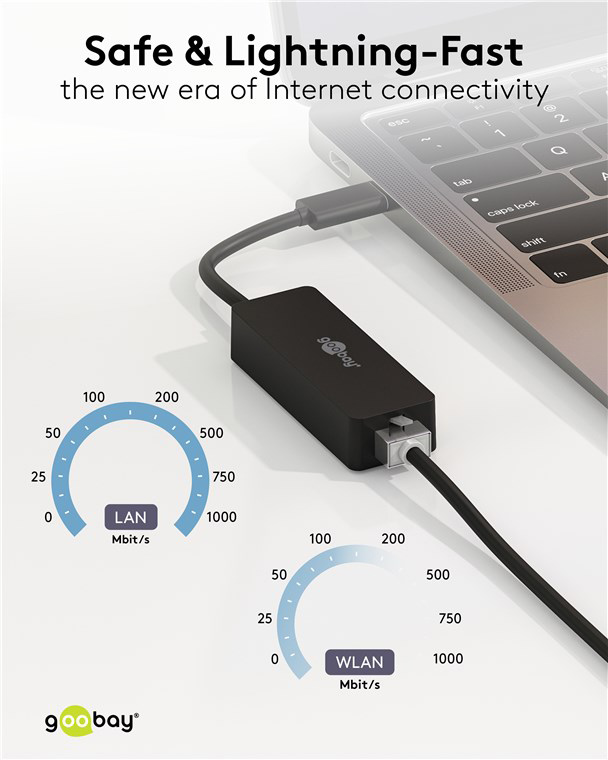 Ο αντάπτορας δικτύου της Goobay συνδέεται στον υπολογιστή ή το laptop σας μέσω θύρας USB-C, επεκτείνοντας τις θύρες του με 1x θύρα RJ45, η οποία επιτρέπει την ενσύρματη σύνδεση στο δίκτυο με ταχύτητες έως 1000Mbps.