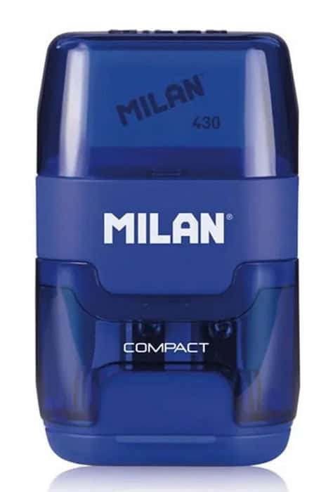 Διπλή ξύστρα μολυβιών της MILAN με γόμα και κάδο απορριμμάτων για καθαρό και εύκολο ξύσιμο των μολυβιών χωρίς υπολείμματα.
