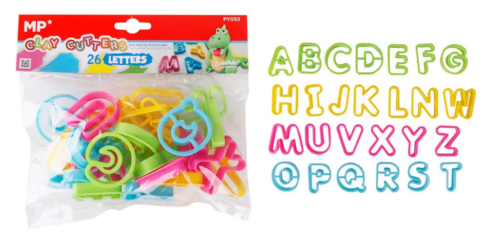 Σετ καλουπιών πλαστελίνης της MP με σχέδια γράμματα, ιδανικά για δημιουργικό παιχνίδι και χειροτεχνίες.