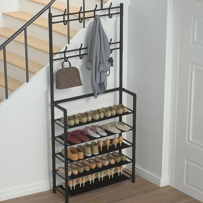Παπουτσοθήκη με 5 ράφια για την αποθήκευση και οργάνωση των παπουτσιών σας. Διαθέτει μεταλλικό συναρμολογούμενο σκελετό και στο πάνω μέρος της εξοπλίζεται με κρεμάστρα για την αποθήκευση ρούχων και άλλων προσωπικών αντικειμένων.