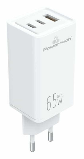 Powertech Φορτιστής Χωρίς Καλώδιο με Θύρα USB-A και 2 Θύρες USB-C 65W Power Delivery / Quick Charge 4.0 Λευκός (PT-1094)