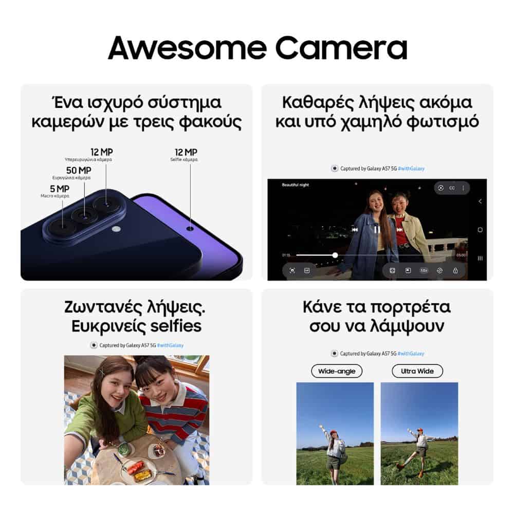 Εξοπλισμένο με κάμερα ευρείας γωνίας OIS 50MP, κάμερα Ultra Wide 12 MP και κάμερα Macro 5 MP, to Galaxy A57 5G σου επιτρέπει να τραβάς φωτογραφίες και βίντεο που είναι φωτεινά και ευκρινή. Διαθέτει ακόμα υποστήριξη Super HDR 12 MP στην μπροστινή κάμερα για ζωντανά video.