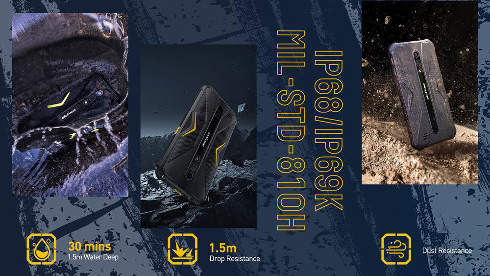 Rugged: Rated IP68 (maximum depth of 1.5 metres up to 30 minutes) under IEC standard 60529, Rated IP69K under IEC standard 60529, MIL-STD-810H Certification