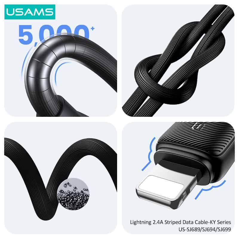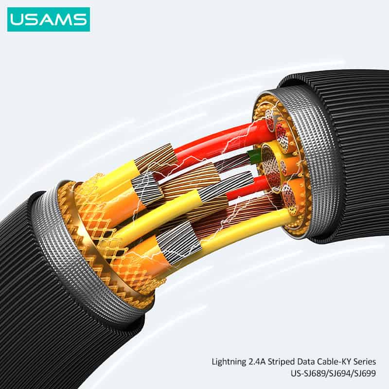Καλώδιο φόρτισης και μεταφοράς δεδομένων Lightning σε USB της Usams. Υποστηρίζει φόρτιση με απόδοση έως 2.4A και μεταφορά δεδομένων με ταχύτητα έως 480Mbps.